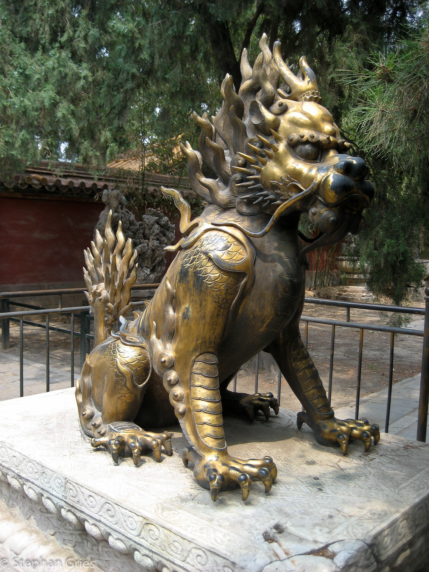 - Jeweils ein männlicher und ein weiblicher Bronzelöwe schützen die Hallen. Hier ein männlicher Löwe, sein Fuß bedeckt eine Kugel.