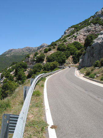Vorbei an der schon geraume Zeit stillgelegten Hotelanlage Su Sirboni geht es an der Marina di Gairo bis zum CP Coccorrocci. Der CP ist nur über eine ca.8km lange Sackgasse zu erreichen, was wohl Ruhe pur garantieren sollte. Schön ist er schon gelegen, aber für unseren Geschmack doch etwas zu abgelegen. Wie gesagt, wirklich eine Sackgasse. So kehren wir um, kreuzen die SS125 und erreichen über eine Nebenstrecke Gáiro. Wir sind nun inmitten einer grandiosen Landschaft, durchpflügt von Serpentinen die jedes Motorradfahrerherz höher schlagen lassen. Über Lanusei wedeln wir hinab nach Tortoli, da auch die Moppeds neue Kraft tanken müssen. Gleich wieder hinauf in die Berge nach Villagrande und weiter nach Talána. Eine seltsame, aber sogleich faszinierende Strecke. Scheinbar möchte man die Straße sich und der Natur überlassen. Sträucher und Blumen wuchern über die Leitplanken, auch herabgestürzter Felsbrocken können schon mal die halbe Straßenbreite blockieren.