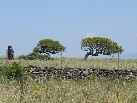 Vom Wind geformte Bäume auf dem Weg zurück nach Porto Torres