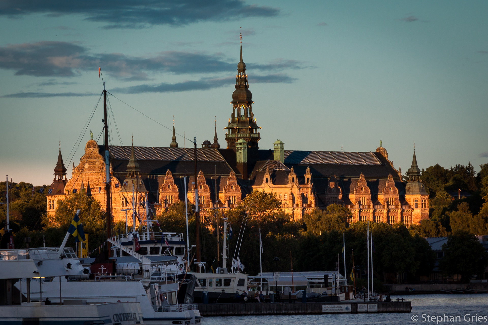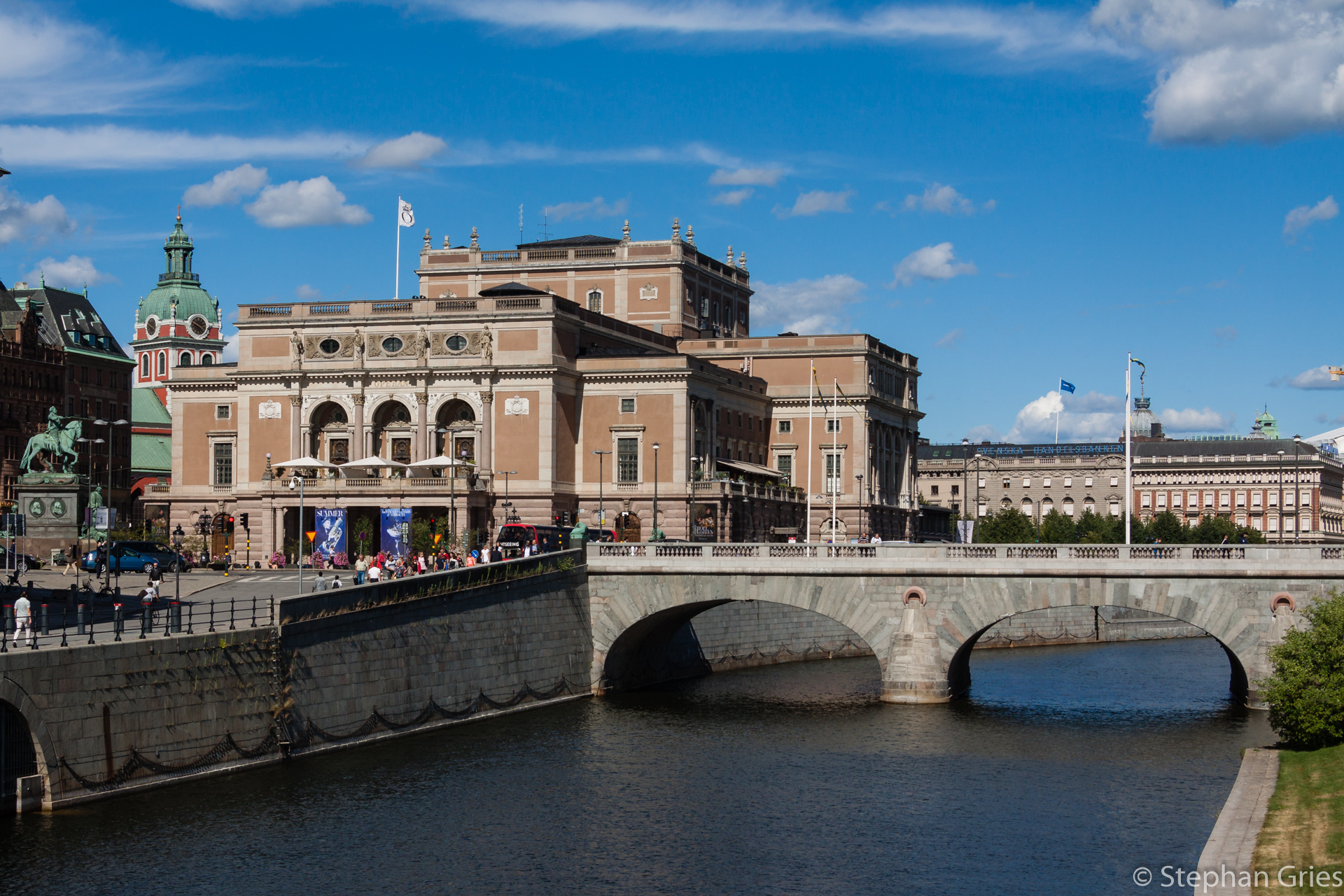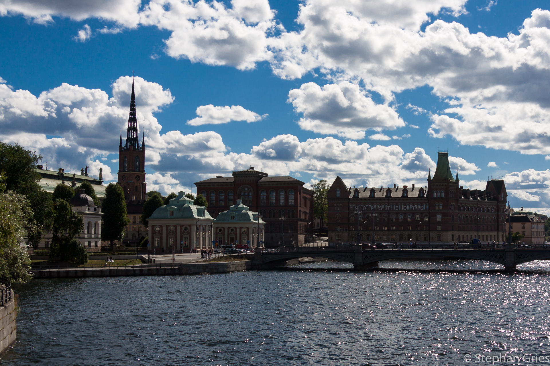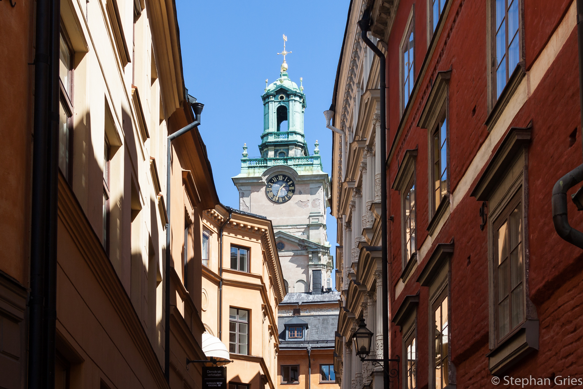 Links das Ritterhaus (Riddarhuset), die Riddarholmskyrkan und rechts der Norstedts Verlag.